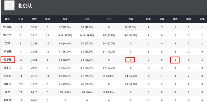 赛后球员们的得分情况被公布出来后,范子铭的那一栏能被被拿来称赞的地方比较有限,他的罚球、篮板、后板、前板、助攻等表格下面都显示“0”的情况下,出现的一次失误格外引人注意。