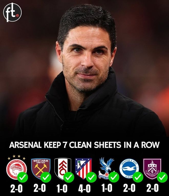 阿森纳的零封盛宴并非偶然,回顾这波强势的 7 场零封之旅,他们先后以 2-0 击败奥林匹亚科斯、2-0 战胜西汉姆联、1-0 小胜富勒姆、4-0 横扫马德里竞技、1-0 力克水晶宫、2-0 拿下布莱顿,再到本场 2-0 击败伯恩利,攻防两端的完美平衡让对手难以招架。