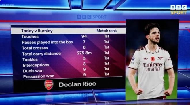 这场比赛中,中场核心赖斯的表现堪称现象级,他不仅踢满全场并贡献一粒头球破门,更在多项关键数据上独占鳌头:全场触球 94 次、将球传入对方禁区 7 次、传中 6 次、带球距离 275.8 米、抢断 5 次、拦截 3 次、对抗成功 9 次、夺得球权 9 次。凭借这样全面且统治级的表现,赖斯以 88% 的得票率毫无悬念地当选本场阿森纳队内最佳球员。